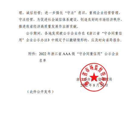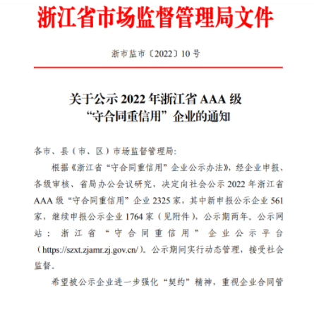 浙江省“守合同重信用”企业公示是社会信用体系建设的重要组成部分,是从企业的社会影响力、合同管理水平、履约能力、履约状况、经营效益和企业社会信誉度等多方面对企业的综合客观评价,“AAA级”则是对企业信用最高级别的评价。